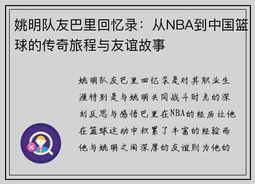姚明明,这个名字在中国篮球界无疑是响当当的。他不仅是中国篮球的代表性人物,更是国际篮坛的一颗璀璨明星。本文将对姚明明的真实身份进行揭秘,探讨其原名背后的故事以及他传奇人生的各个方面。从姚明明的成长经历、职业生涯、个人成就到他退役后的影响力,我们将全面解析这位传奇球星如何从一个普通孩子成长为全球瞩目的体育巨星。通过这些深入剖析,读者能够更好地了解姚明明所代表的不仅是一项运动,更是一种精神和文化。 ...