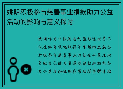 姚明,这位中国篮球的传奇人物,以其卓越的球技和坚定的信念在国际篮球舞台上独树一帜。他不仅是一位出色的运动员,更是一个充满魅力与坚持的人。姚明在职业生涯中所展现出来的不屈精神和真实形象,让他在体育界赢得了无数尊敬。在这篇文章中,我们将从四个方面探讨姚明的魅力与坚持:他的职业生涯成就、对中国篮球发展的影响、个人品德及社会责任感,以及他如何塑造了自己的公众形象。这些方面共同构建了一个不油腻且令人敬佩的姚...